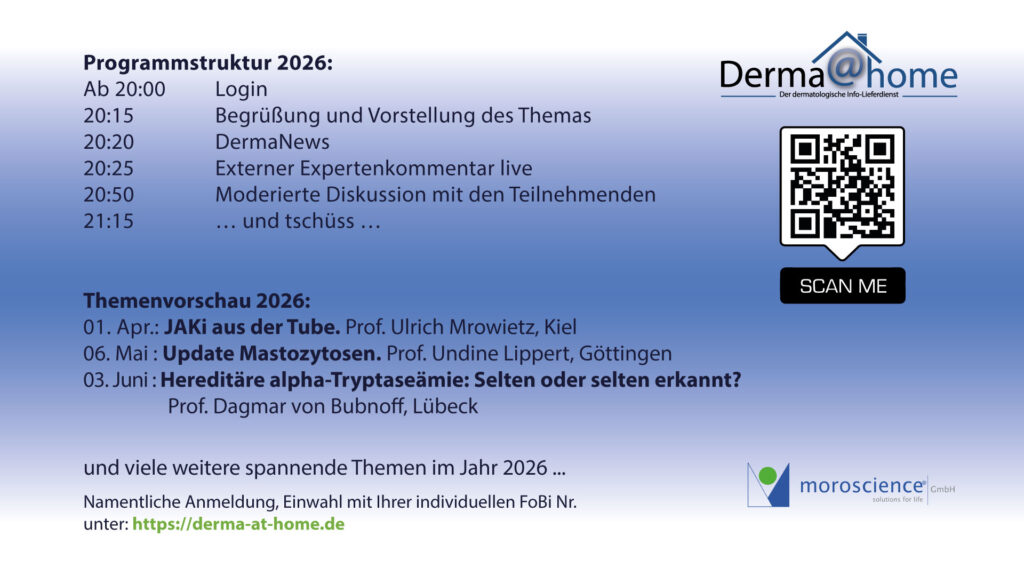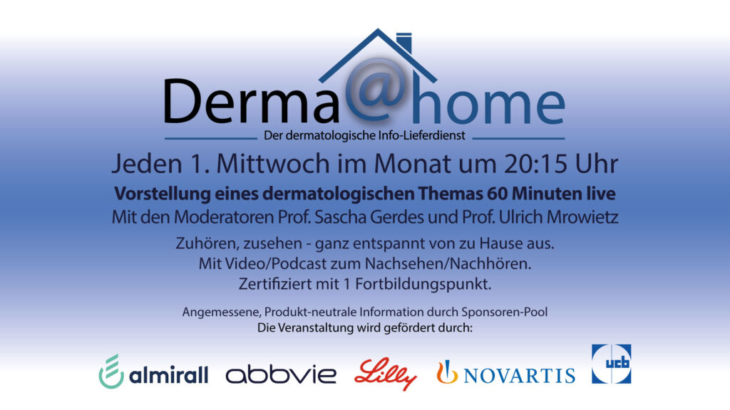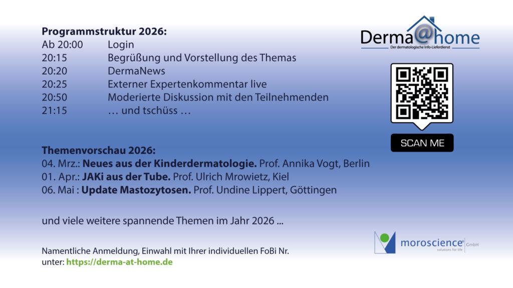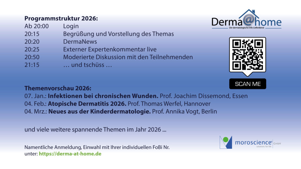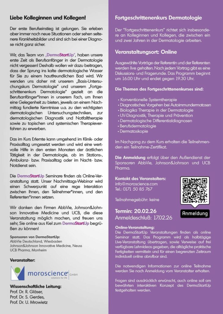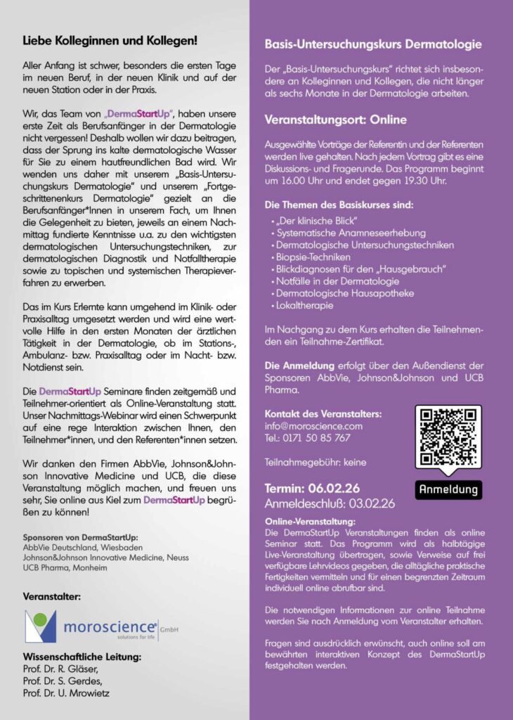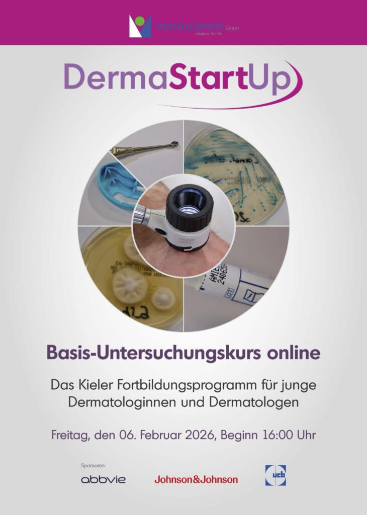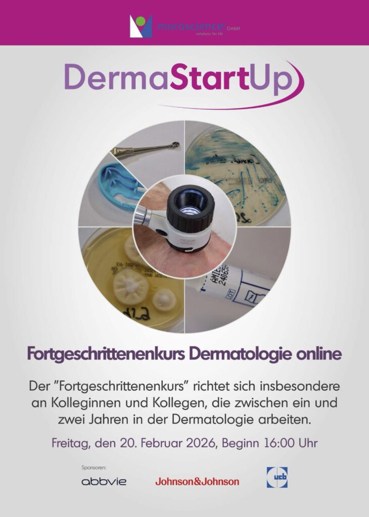 Termine Flyer zu aktuellen Veranstaltungen Derma@home: Jeden ersten Mittwoch des Monats DermaStartUp: Basis-Untersuchungskurs online 06.02.2026 DermaStartUp: Fortgeschrittenenkurs Dermatologie online 20.02.2026